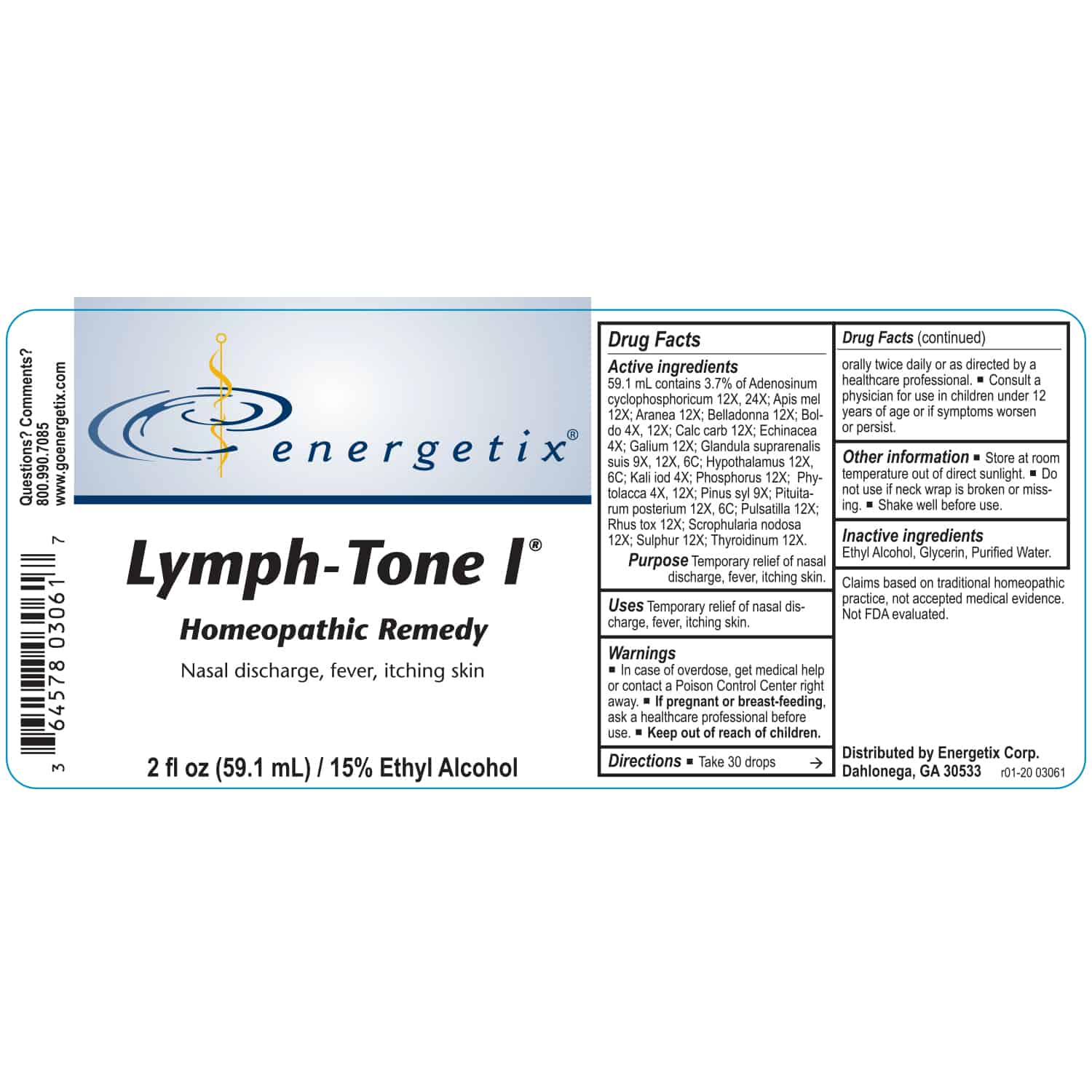 Lymph-Tone I® is a homeopathic combination formula for recent symptoms such as mucous discharge; irritated, watery eyes; cough; high-grade fever; excessive perspiration; skin eruptions; redness and swelling; sleeplessness; frequent urination; nausea; diarrhea