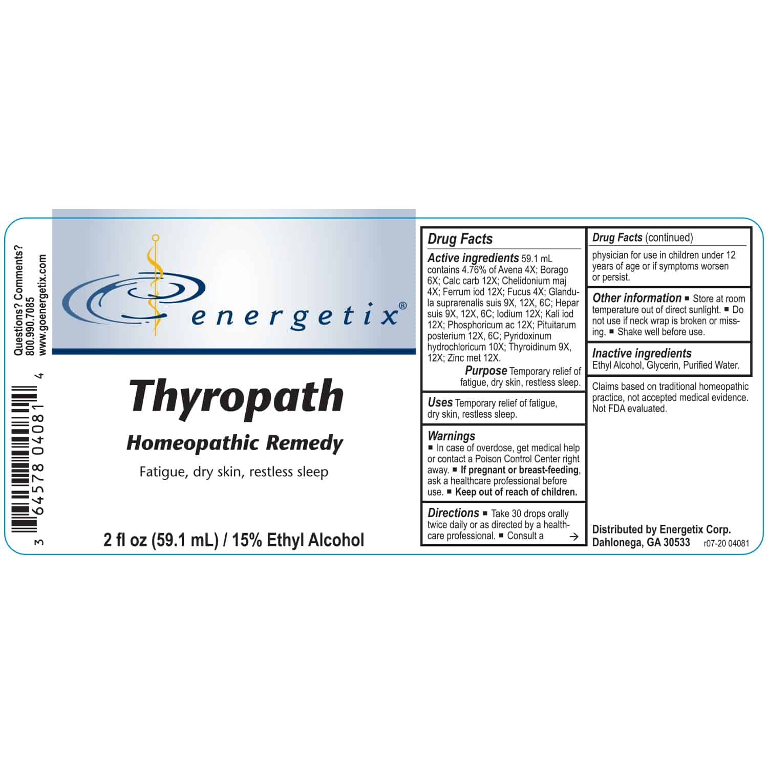Thyropath is a homeopathic combination formula for symptoms of thyroid weakness. The thyroid gland is central to metabolism and is vulnerable to many of the effects of modern life including stress, dietary deficiencies, medication, and environmental toxins. Included in the formula are homeopathically-prepared iodine, sea kelp, vitamin B6, and sarcode remedies from healthy tissues.