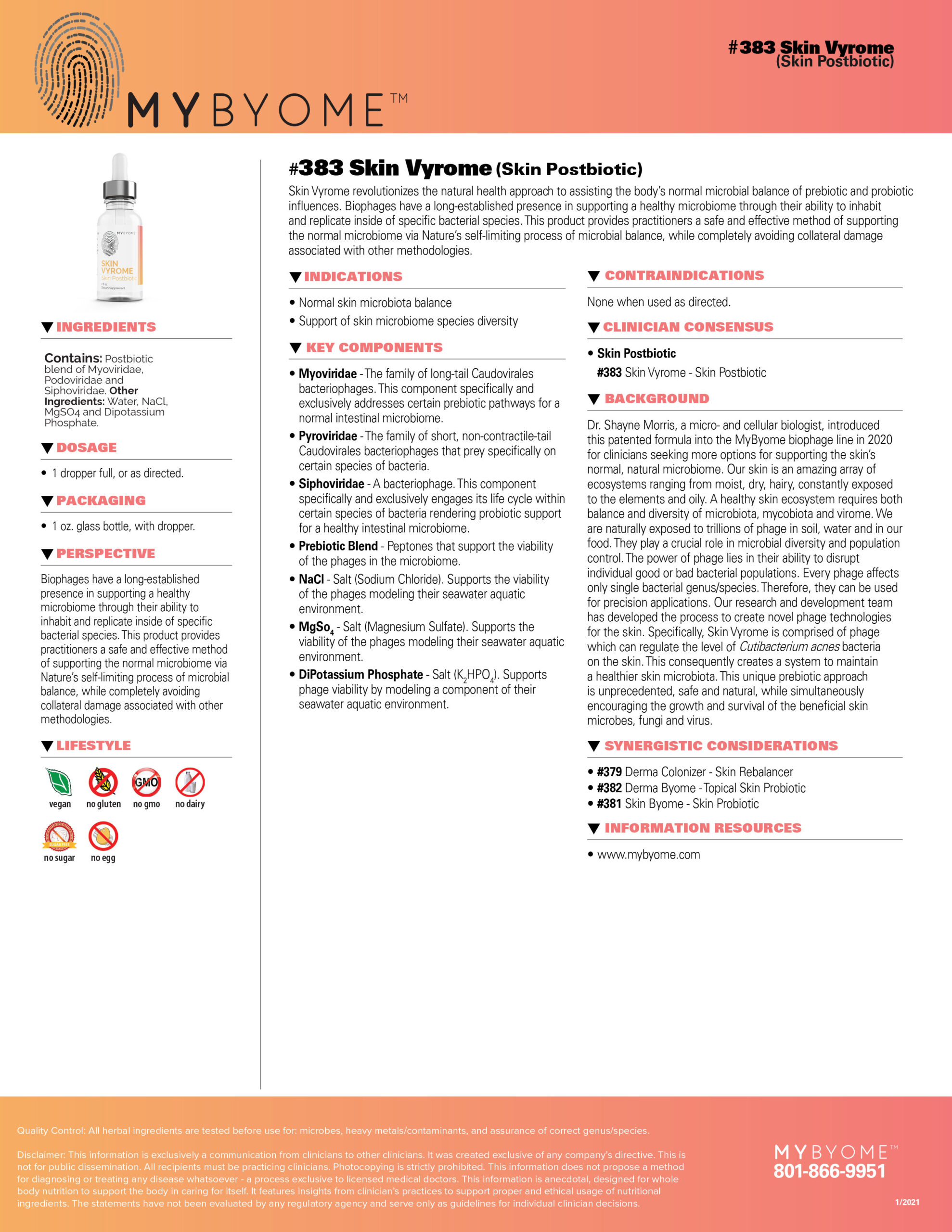 SKIN VYROME revolutionizes the natural health approach to assisting the body’s normal microbial balance of prebiotic and probiotic influences. Biophages have a long-established presence in supporting a healthy microbiome through their ability to inhabit and replicate inside of specific bacterial species. This product provides practitioners a safe and effective method of supporting the normal microbiome via nature’s self-limiting process of microbial balance, while completely avoiding collateral damage associated with other methodologies.